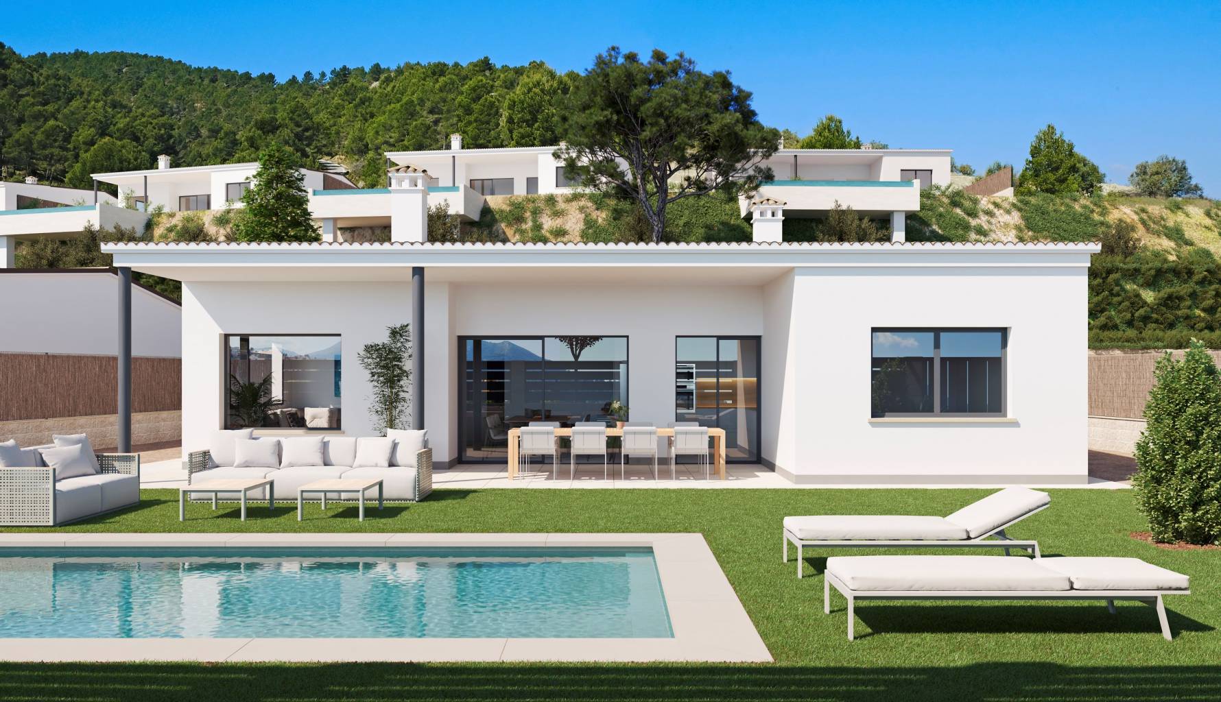 The homes feature spacious terraces and private gardens, perfect for enjoying the outdoors and the natural surroundings of Penáguila. Additionally, there is the option to include a private pool, adding a touch of luxury and exclusivity to each property. Integrated pergolas offer a shaded space ideal for relaxation or outdoor gatherings, while the communal garden areas complement the setting, providing additional space for recreation and connection with nature.