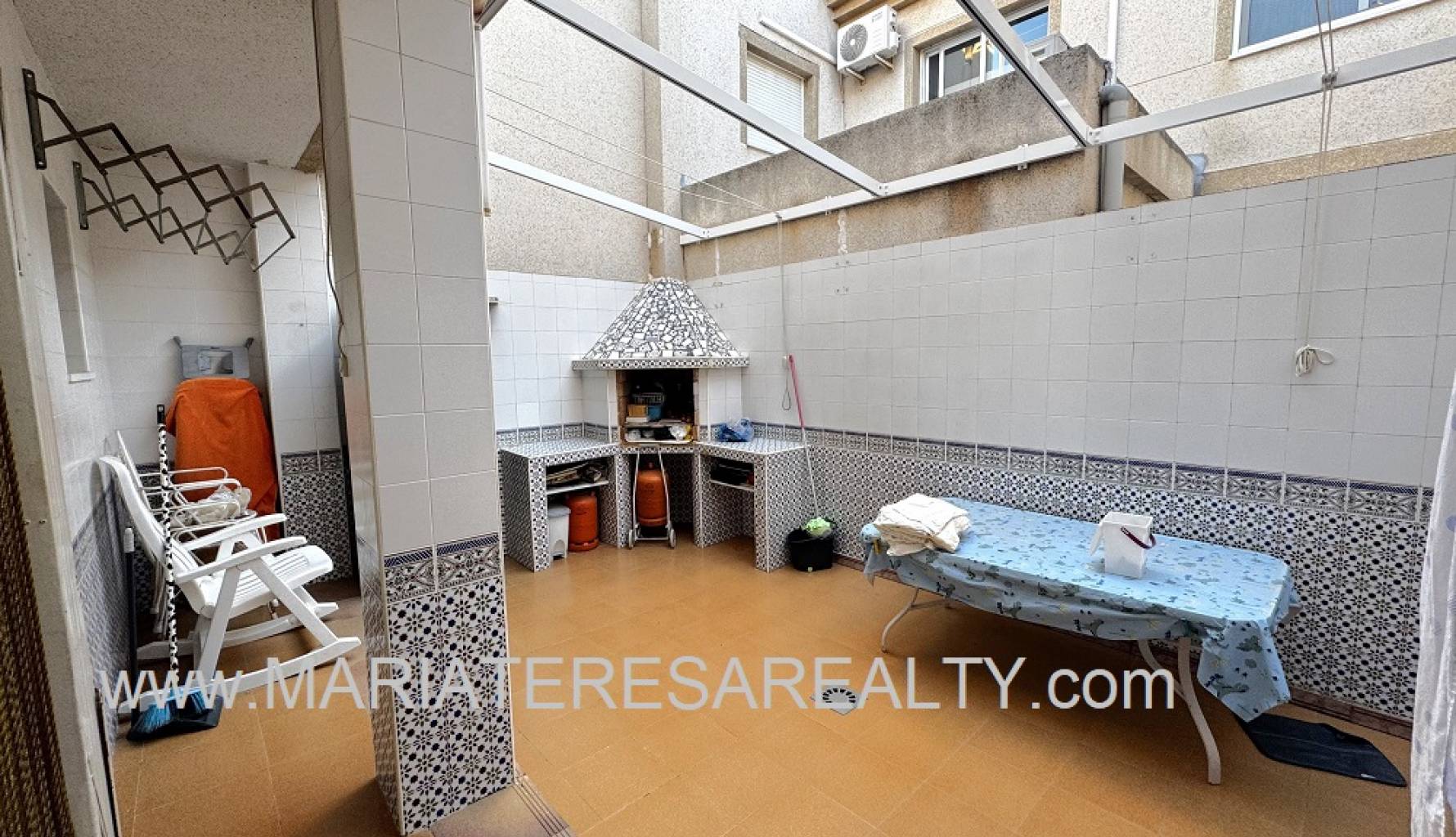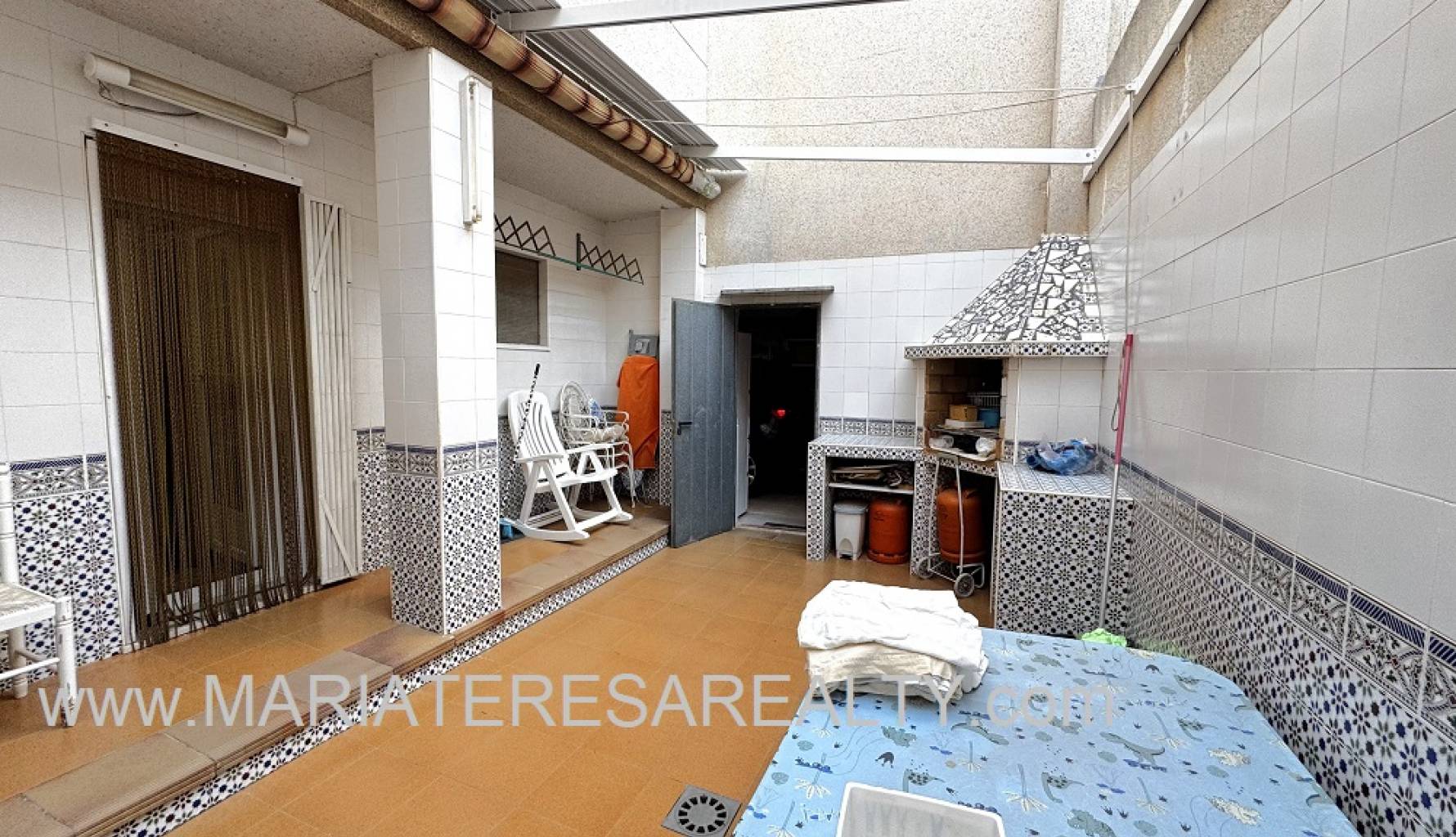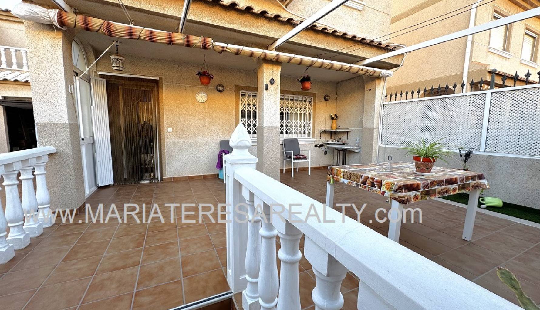 Wonderful duplex with a spacious 90m2 garden with awnings and a 28m2 garage. On the ground floor, which comprises 53m2, there is a small entrance hall separating the entrance from the living room. A spacious living/dining room with a decorative fireplace leads to a small pantry under the stairs, a bathroom with a shower, and a fully equipped independent kitchen with access to a large back patio with a built-in barbecue and awnings. The patio connects directly to the garage, which in turn has stairs leading to a 28m2 attic with a balcony and a working fireplace. The upper floor of this duplex has a constructed area of 67m2 and consists of four spacious bedrooms with built-in wardrobes and a bathroom with a shower. Two of the bedrooms, as well as the living room and the hallway leading to the bedrooms, are equipped with air conditioning. This house has security bars, double-glazed windows, mosquito nets on the windows and on the doors leading into the house and out to the patio.