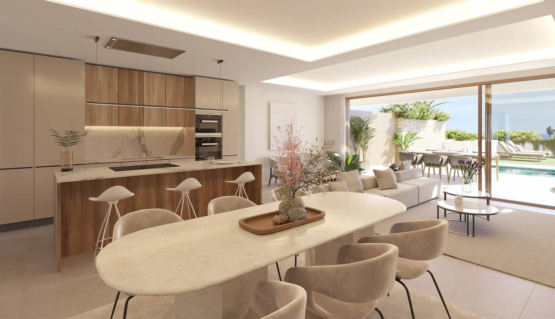 The interior of these homes is designed to offer a welcoming and modern environment. The apartments feature two or three bedrooms and two bathrooms, providing a functional and comfortable space for families of different sizes. The porcelain tile flooring adds a touch of elegance and durability. The homes are equipped with air conditioning and underfloor heating, ensuring a comfortable environment year-round. Built-in wardrobes offer ample storage space, while home automation and high-end appliances make daily life easier. The video intercom adds an additional level of security and convenience.