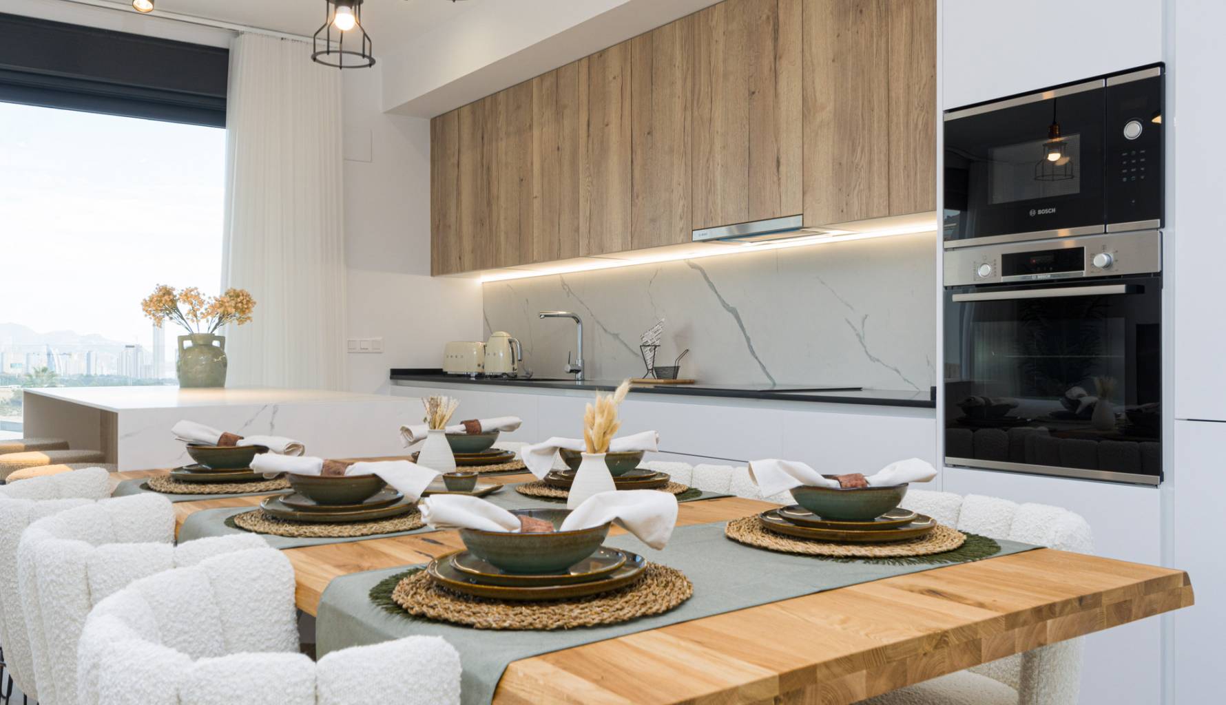 The interiors of the homes are designed with a focus on comfort and modernity. Layout options include 2 and 3-bedroom homes, all with 2 bathrooms, ensuring ample space for families of different sizes. High-quality finishes include ceramic and porcelain floors, which are not only aesthetically pleasing but also durable. The homes are equipped with smart home technology, electric shutters, and video intercom, facilitating a modern and secure lifestyle. Additionally, they feature underfloor heating, built-in wardrobes, and integrated appliances, ensuring every detail is considered for daily comfort.