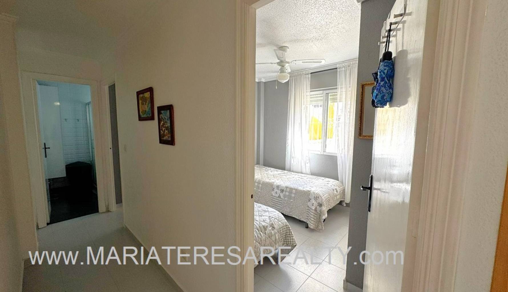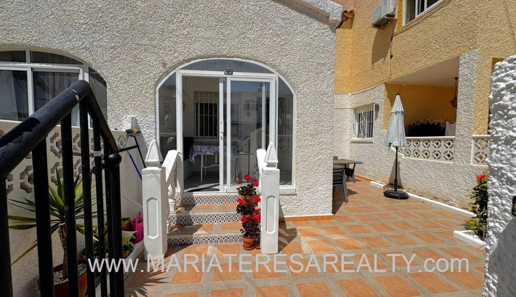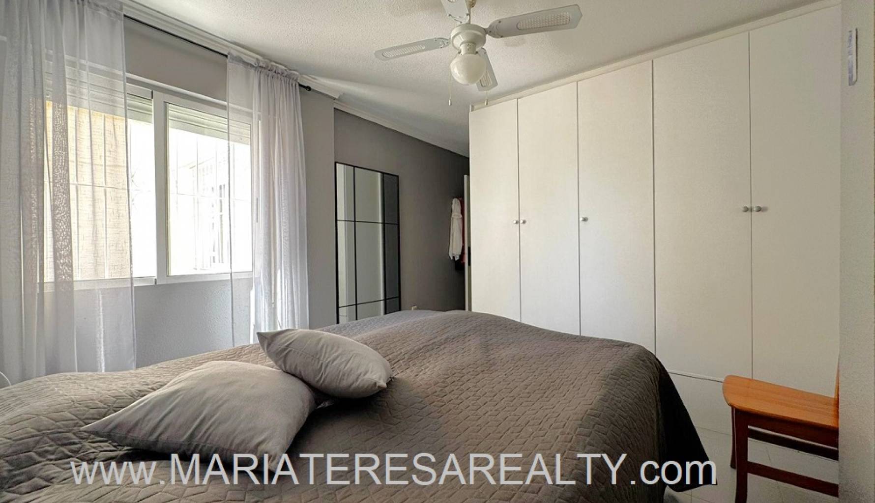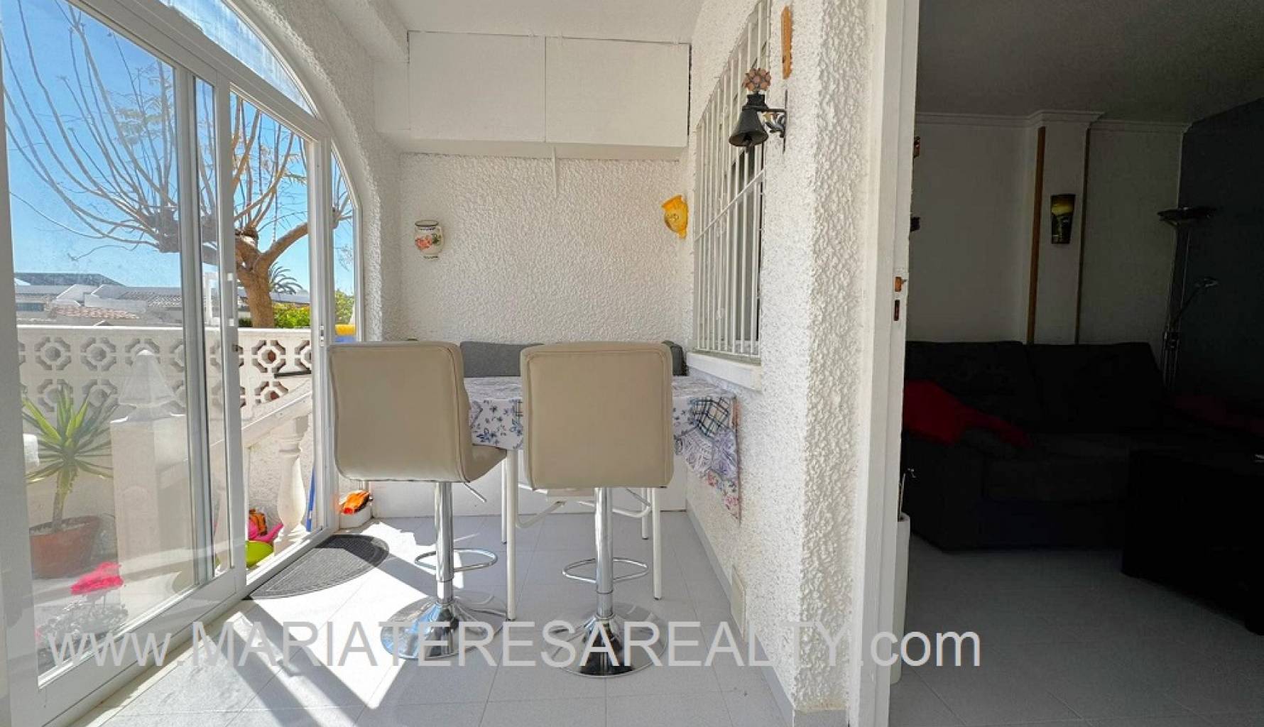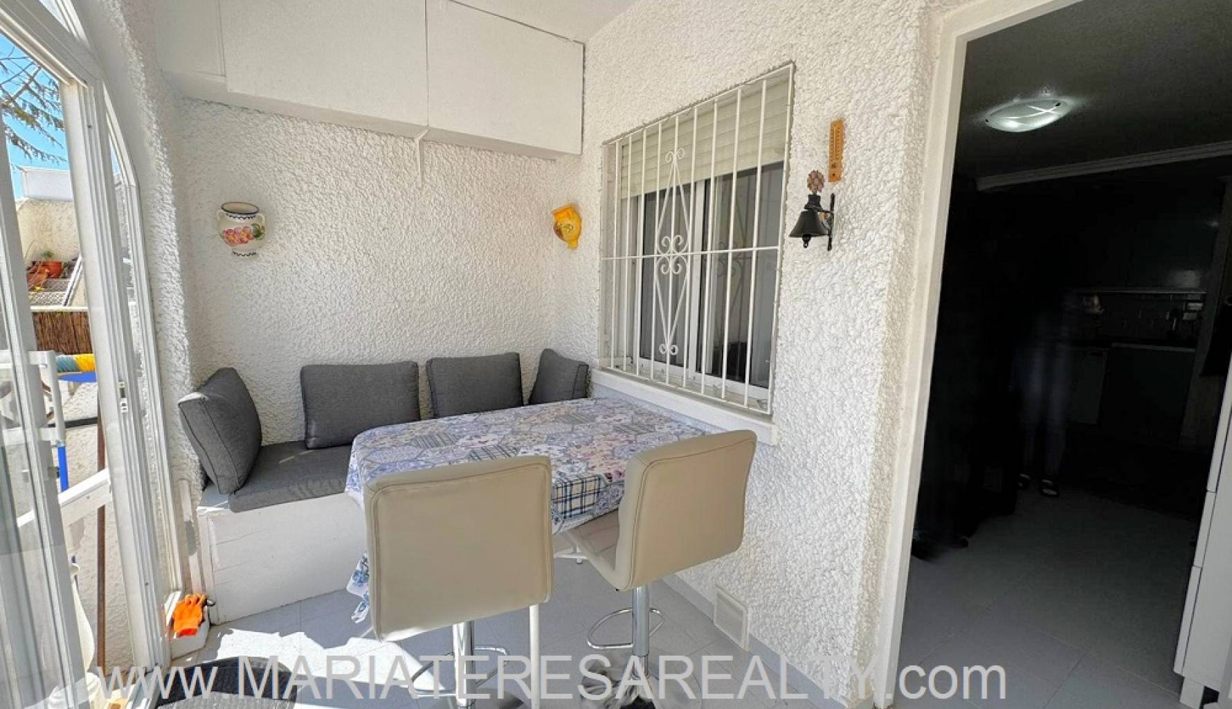 Ideal ground floor bungalow with a private garden in the Oasis urbanization in Los Narejos, just 700 meters from the Las Velas shopping center and less than 2 kilometers from the beach. Before entering the property, there is a spacious 25m² garden which, thanks to its east-facing orientation, enjoys sunshine for most of the day. Upon entering the apartment, there is an enclosed porch of approximately 8.25m² with large windows that allow natural light to flood the interior. Inside, there is a large living/dining room with a newly renovated open-plan kitchen and a built-in storage cupboard. Continuing down the hallway, there is a bedroom with a built-in wardrobe, a newly renovated bathroom with a shower, and a spacious master bedroom with a custom-made wardrobe.
