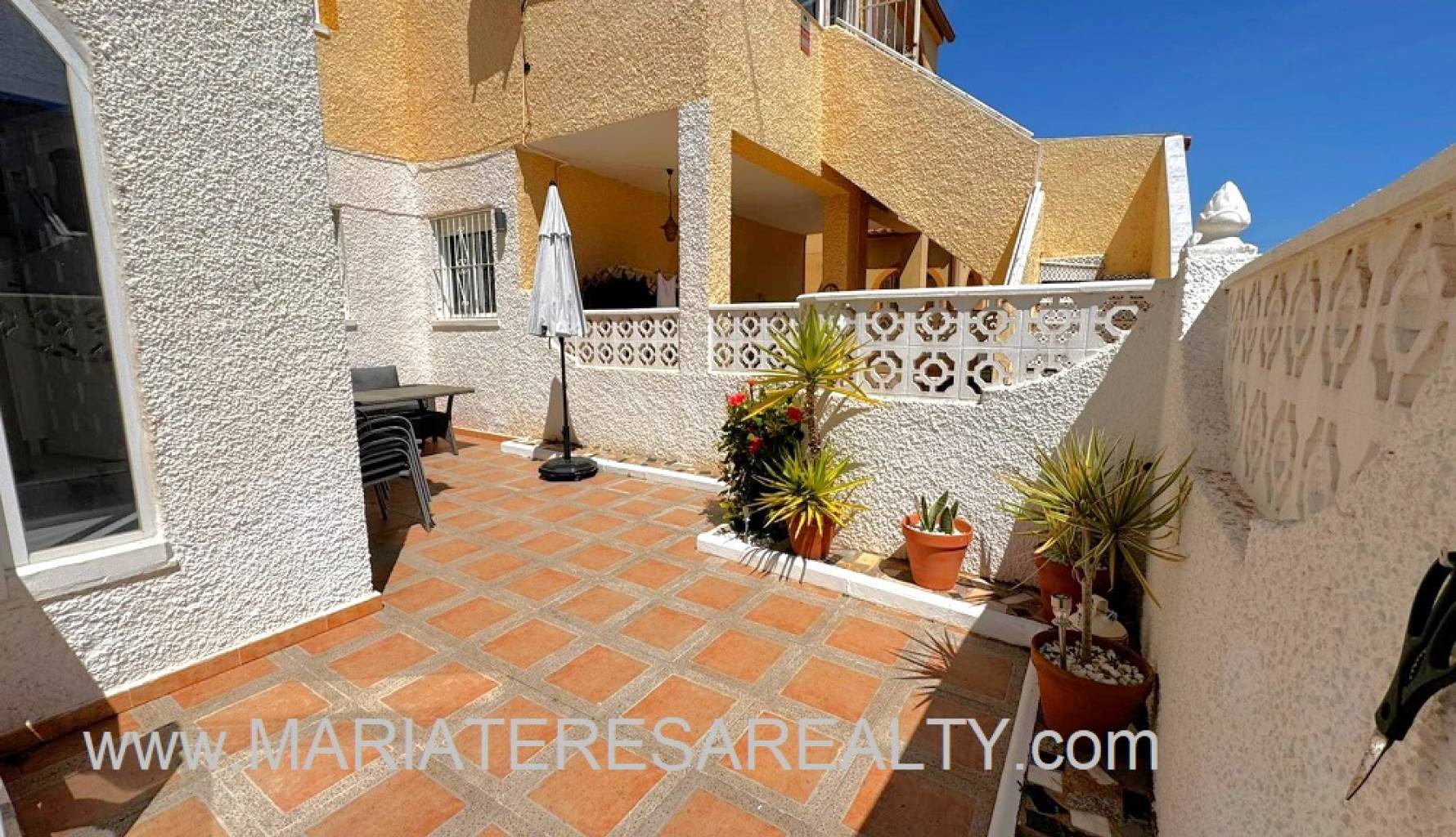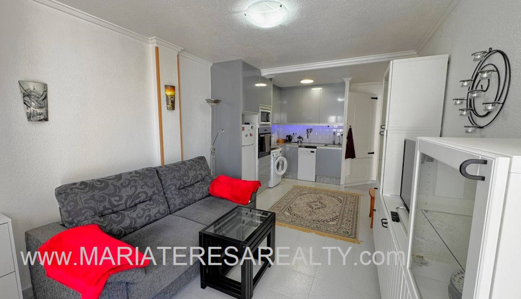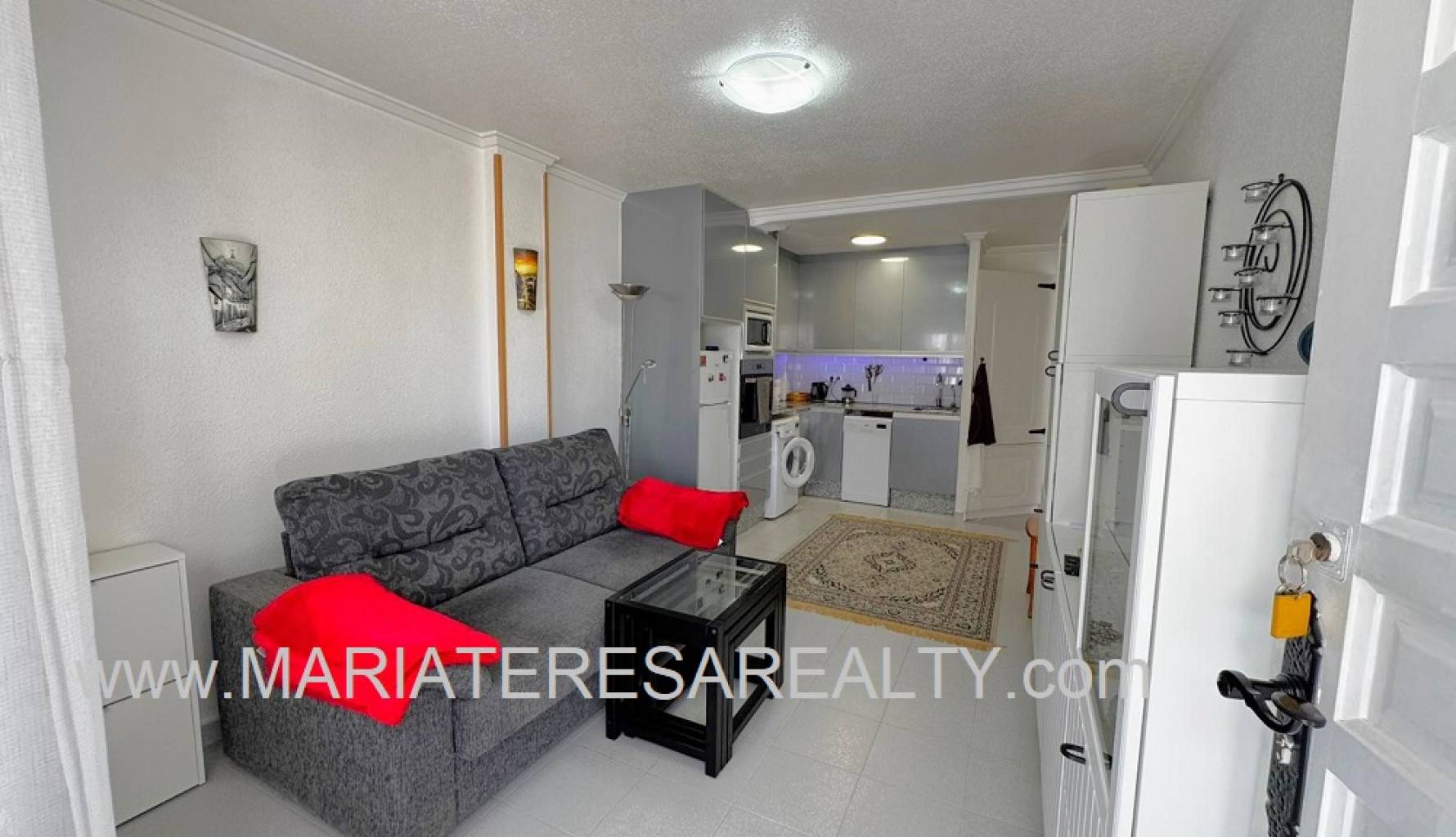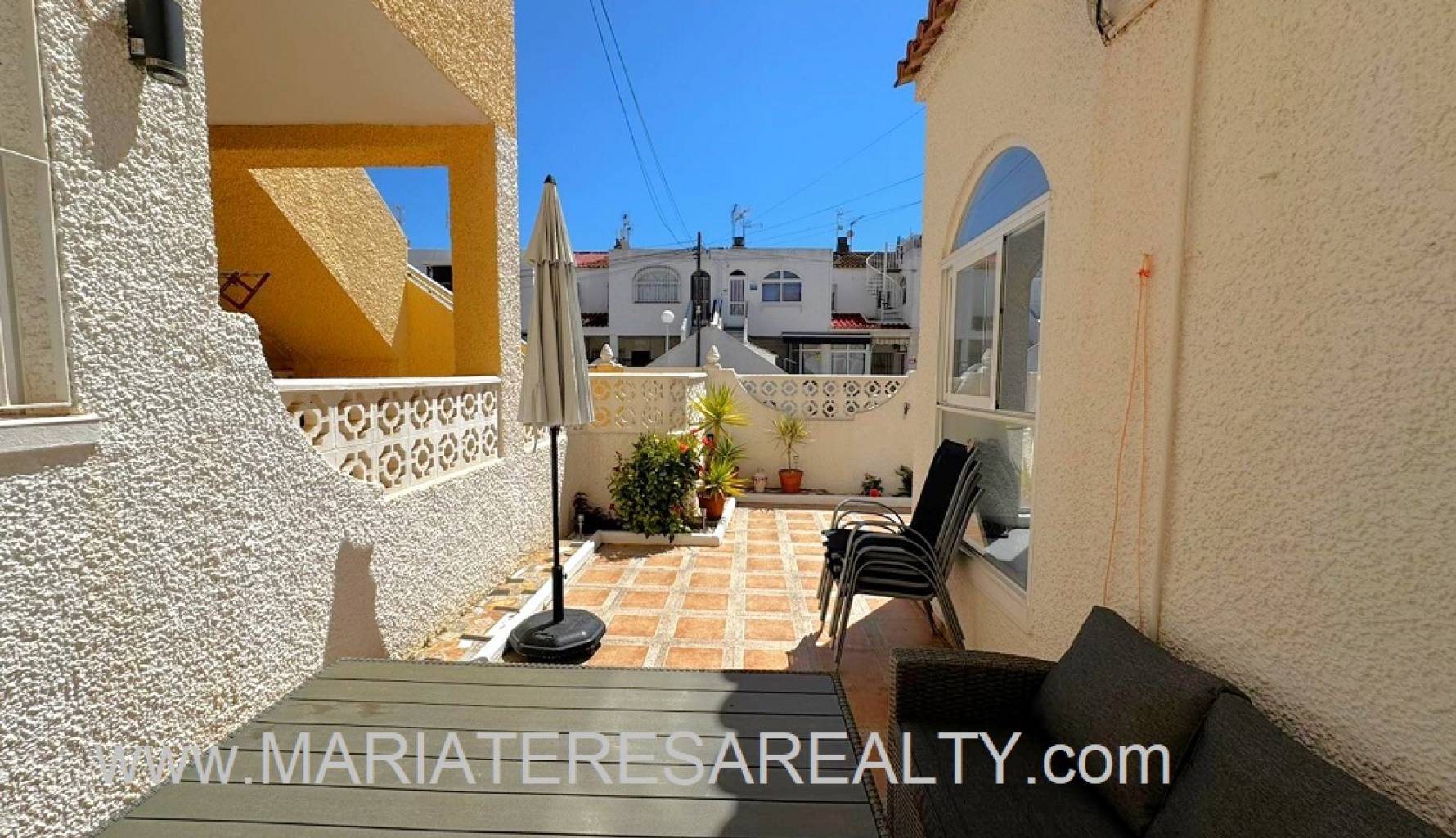 Ideal ground floor bungalow with a private garden in the Oasis urbanization in Los Narejos, just 700 meters from the Las Velas shopping center and less than 2 kilometers from the beach. Before entering the property, there is a spacious 25m² garden which, thanks to its east-facing orientation, enjoys sunshine for most of the day. Upon entering the apartment, there is an enclosed porch of approximately 8.25m² with large windows that allow natural light to flood the interior. Inside, there is a large living/dining room with a newly renovated open-plan kitchen and a built-in storage cupboard. Continuing down the hallway, there is a bedroom with a built-in wardrobe, a newly renovated bathroom with a shower, and a spacious master bedroom with a custom-made wardrobe.