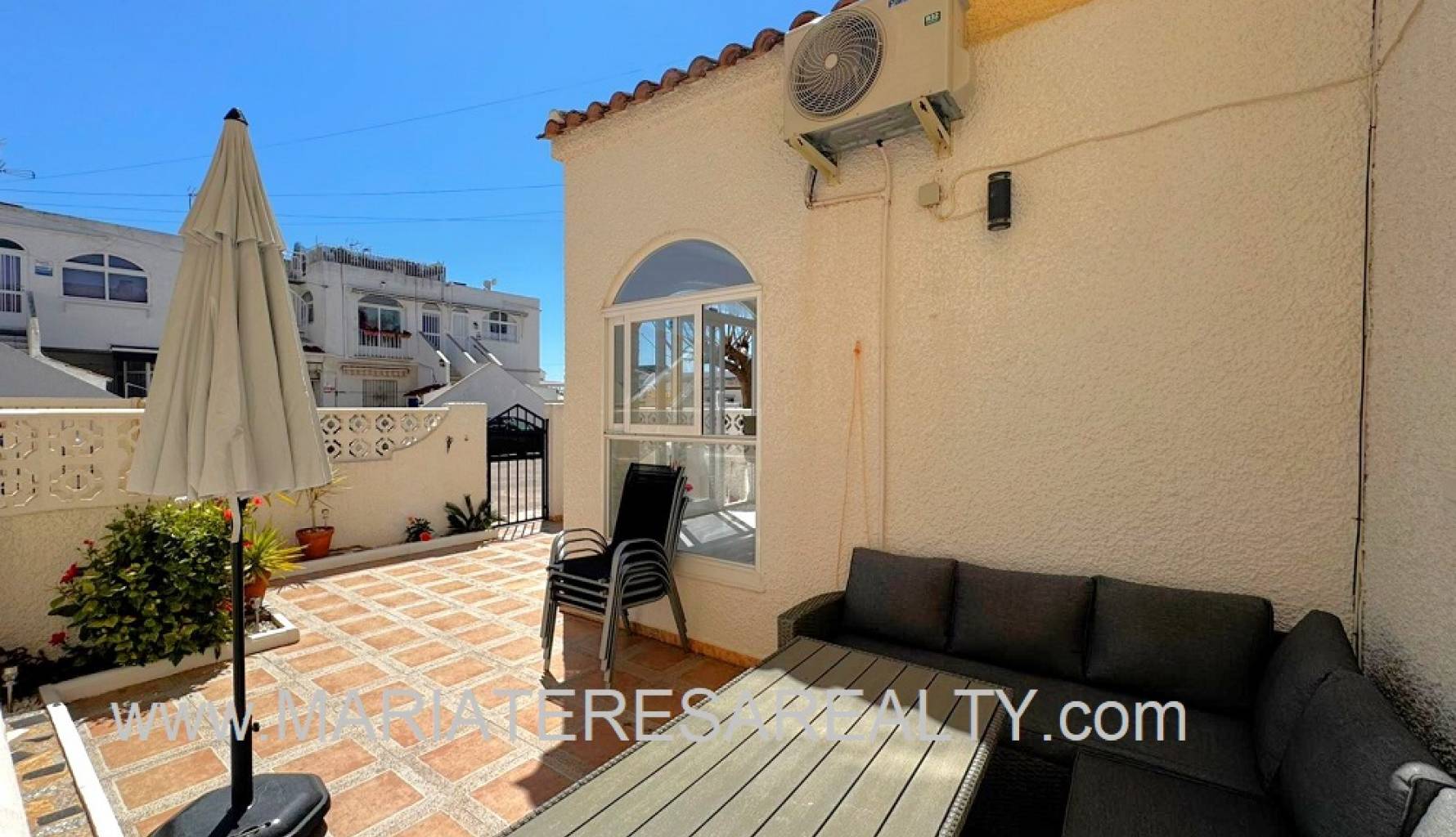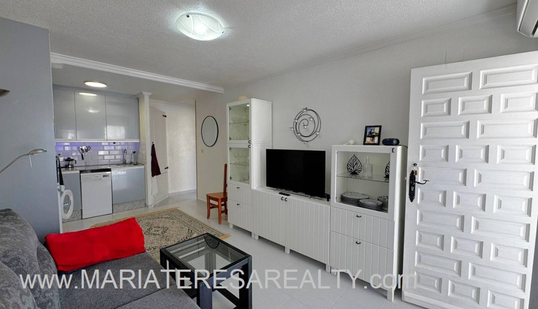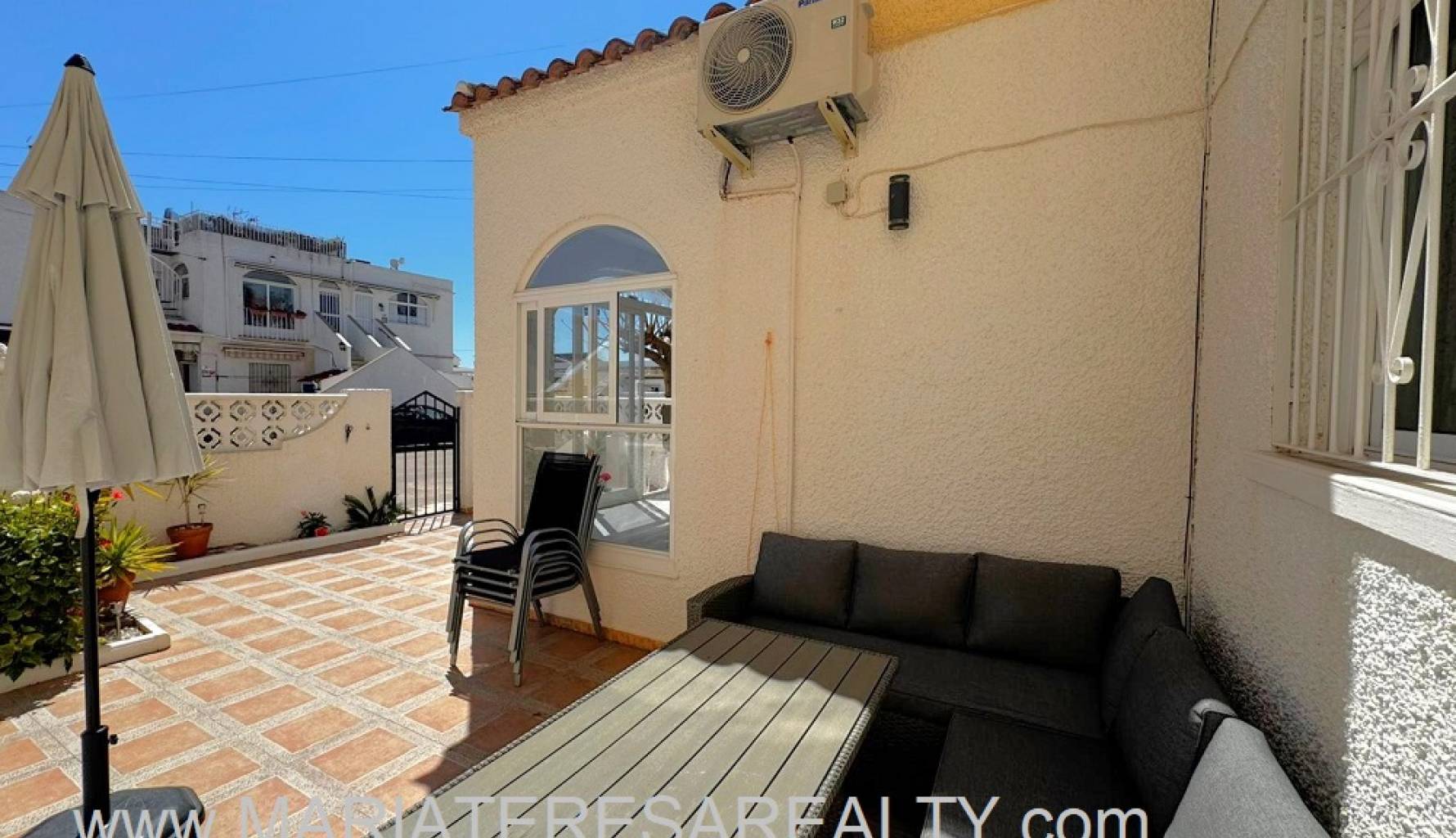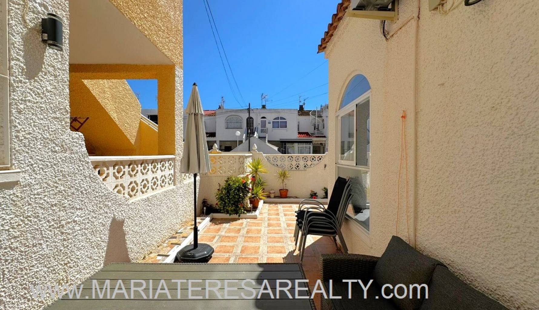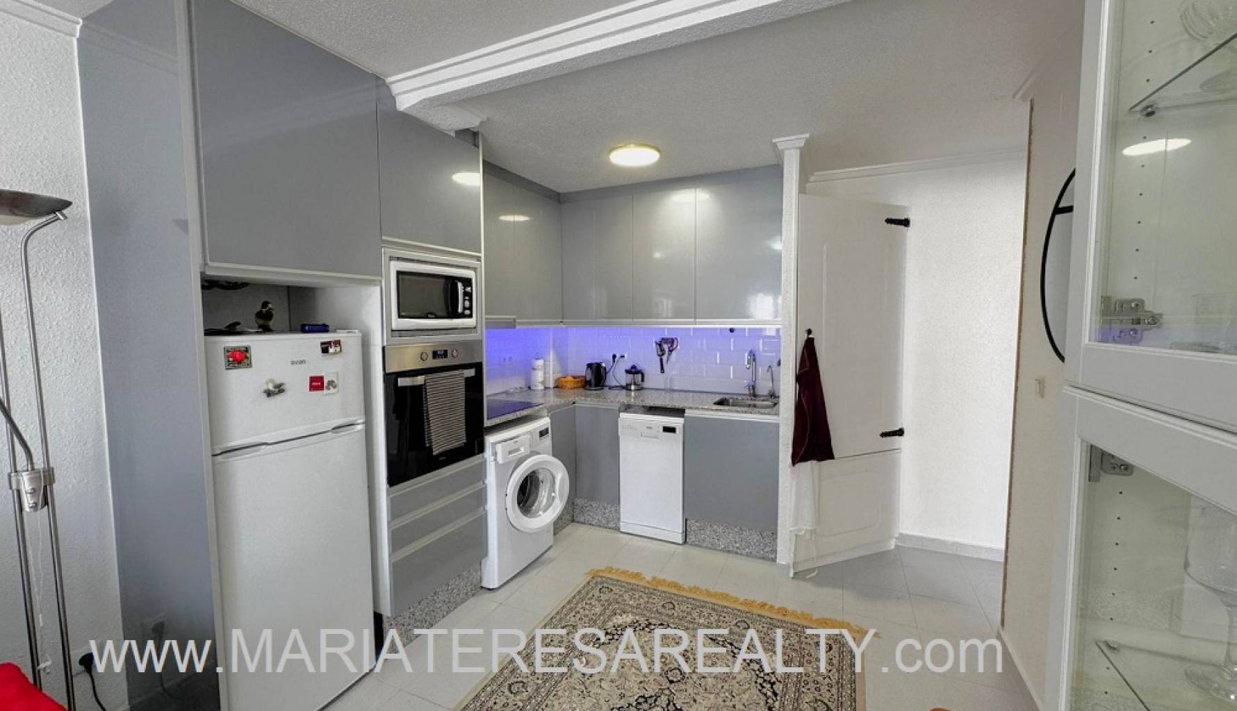 Ideal ground floor bungalow with a private garden in the Oasis urbanization in Los Narejos, just 700 meters from the Las Velas shopping center and less than 2 kilometers from the beach. Before entering the property, there is a spacious 25m² garden which, thanks to its east-facing orientation, enjoys sunshine for most of the day. Upon entering the apartment, there is an enclosed porch of approximately 8.25m² with large windows that allow natural light to flood the interior. Inside, there is a large living/dining room with a newly renovated open-plan kitchen and a built-in storage cupboard. Continuing down the hallway, there is a bedroom with a built-in wardrobe, a newly renovated bathroom with a shower, and a spacious master bedroom with a custom-made wardrobe.