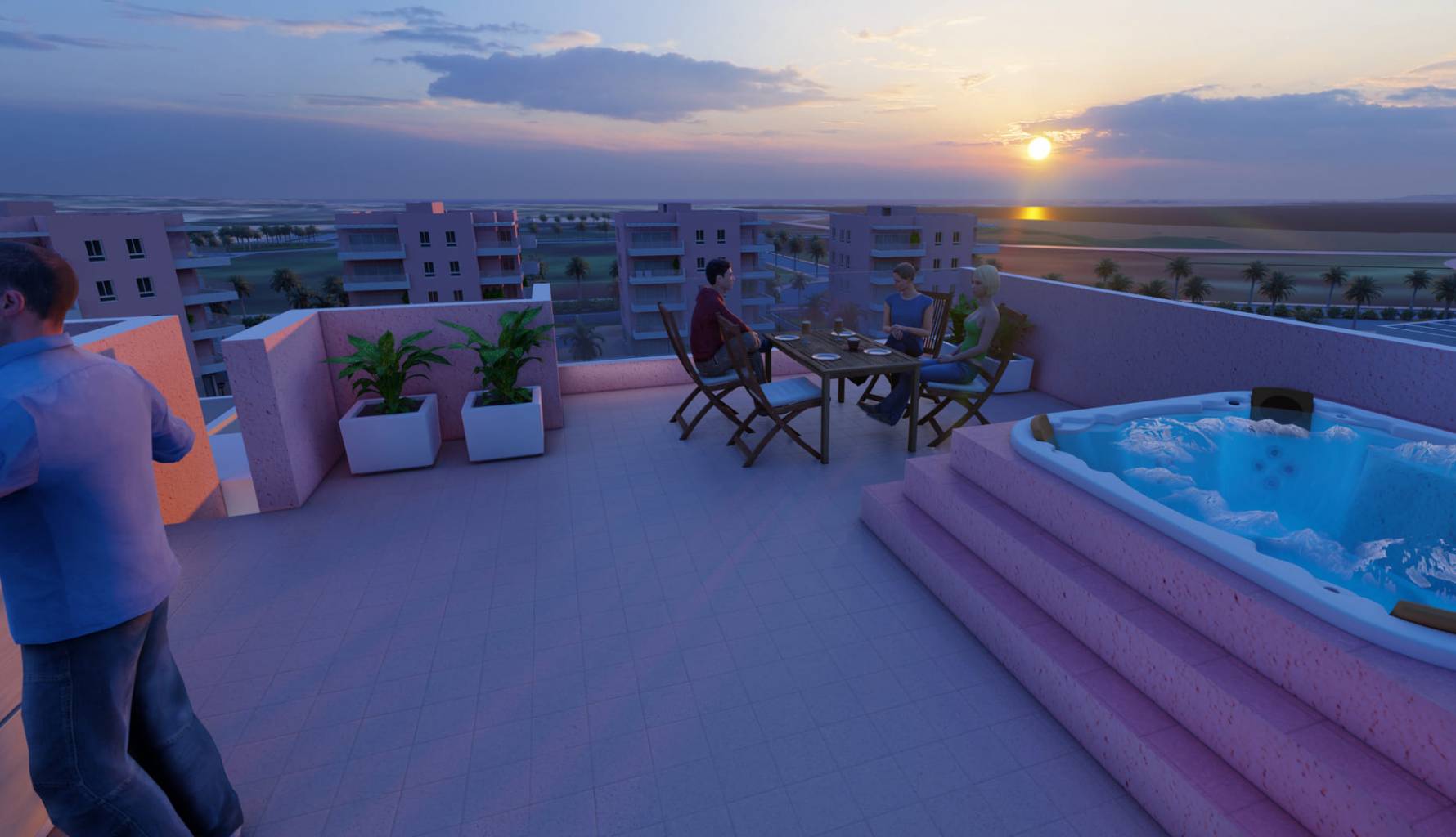 The exteriors of this residential are designed to maximize enjoyment of the Mediterranean climate. The properties feature private gardens, ideal for enjoying outdoor moments in a tranquil setting. Additionally, each property has a terrace, providing additional space to relax or entertain guests. For those seeking exclusive space, the penthouses offer the advantage of a private solarium, perfect for sunbathing in complete privacy. The proximity to the sea, just 3 kilometers away, allows for enjoyment of sea views and breezes, making every day a refreshing experience.